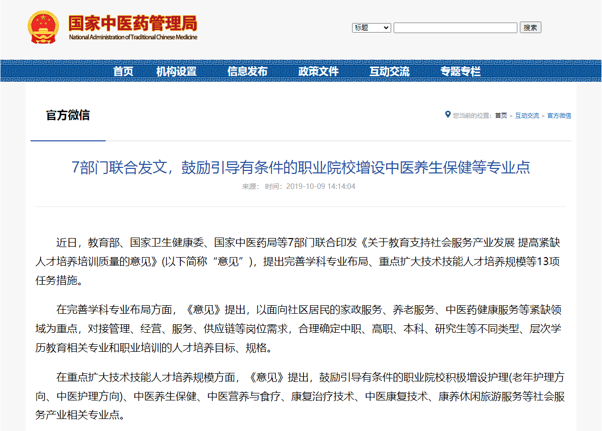 7部门联合发文,鼓励引导有条件的职业院校增设中医养生保健等专业