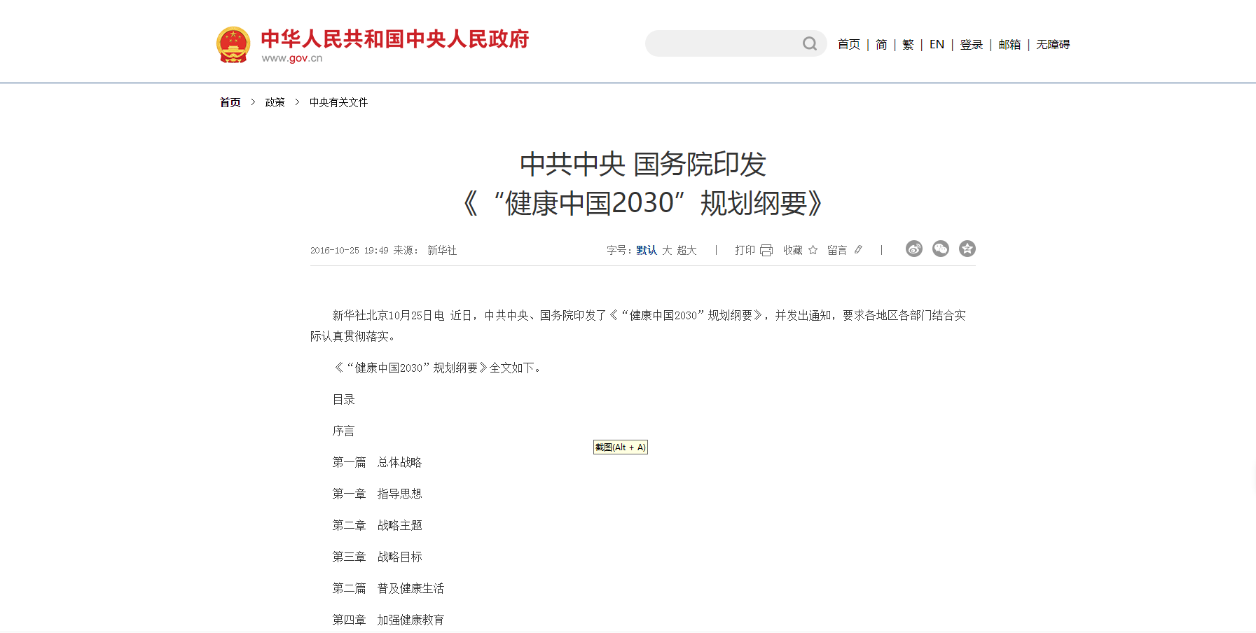 中共中央 国务院印发 《“健康中国2030”规划纲要》